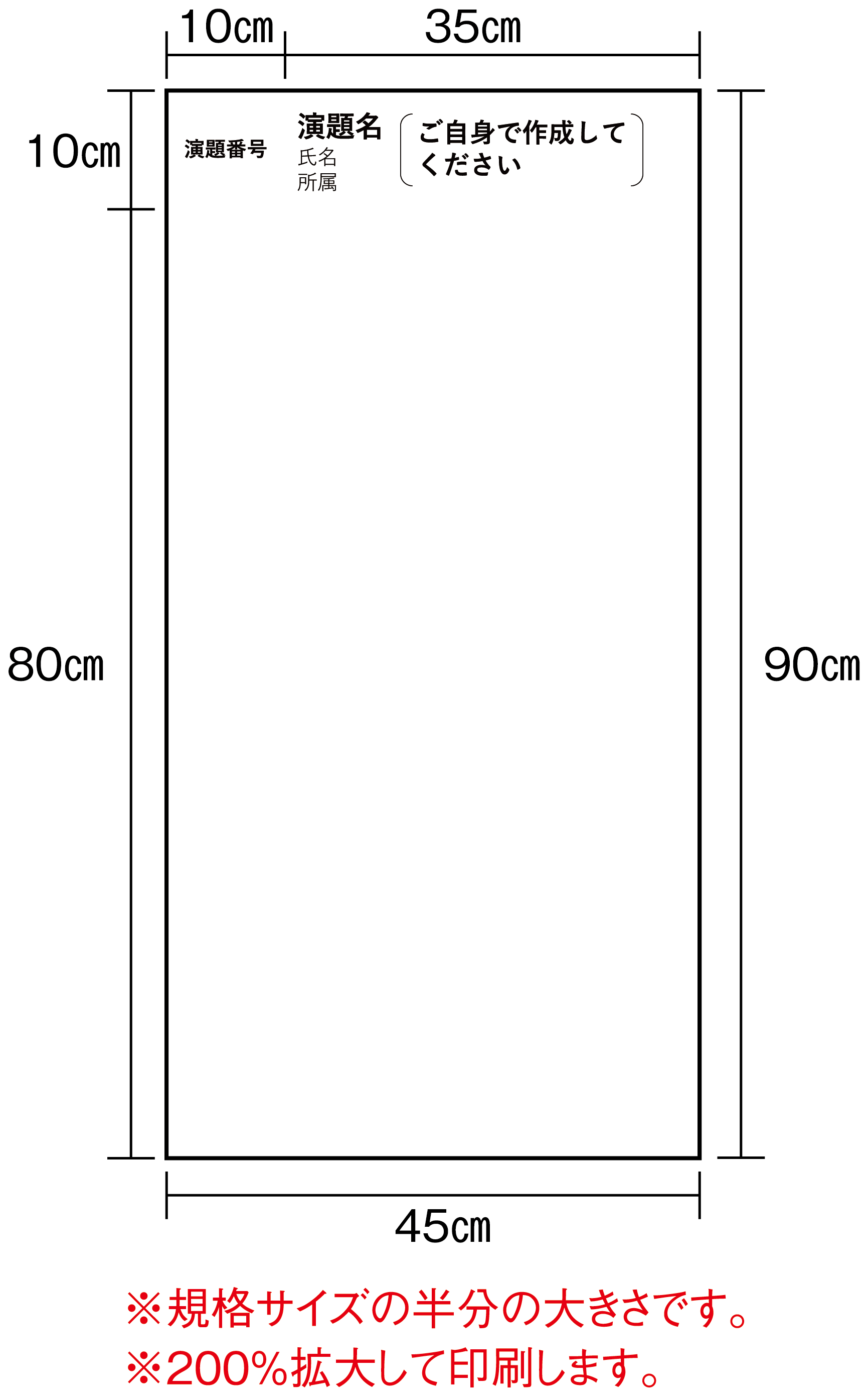 掲示用ポスターの比率と同じです。(規格サイズの半分の幅45cm×高さ90cmとなっており、印刷時に200%拡大いたします。)